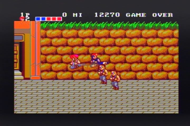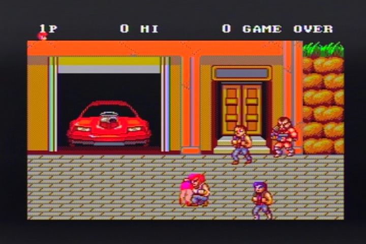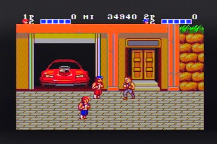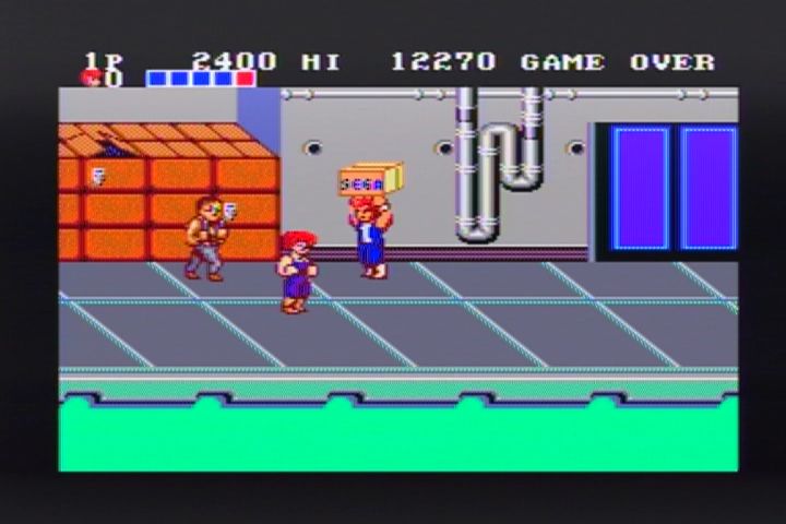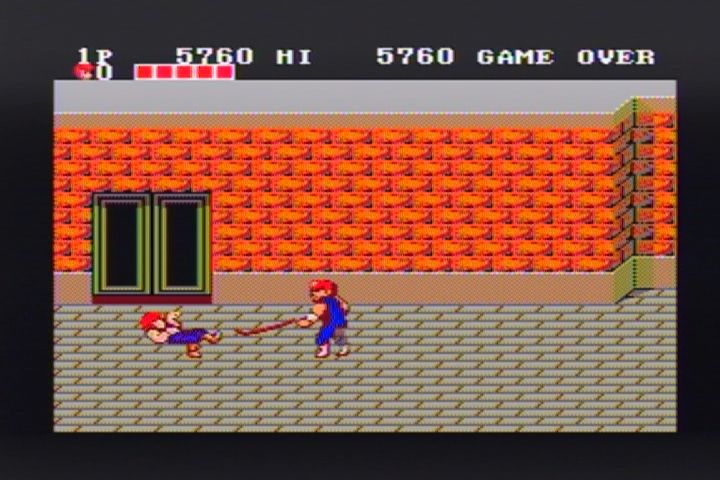 ゲームをスタートさせるとヒロインが連れ去られます。 多いですよね、このパターン。 ヒロインを助け出すと目的もはっきりしてます。 一足違いで主人公のビリーが登場。 早速、敵が出てくるのでバッサバッサとなぎ倒して進んでいきます。 画面上部の青いマスというか四角が体力ゲージ。 全部なくなるとやられちゃいます。 全体的に動きは鈍いというか、硬いというか・・・ まあ、スムーズじゃないです。 当時としては標準的だった・・・かなぁ。もうちょっとキビキビ動いて欲しかった。 ゲームのジャンルとしてはベルトスクロールタイプのアクションゲーム。 今では『ファイナルファイト系』と言えば解りやすいでしょうか。 ファイナルファイトが出る前は『ダブルドラゴン系』で通じてたんですよ。 ゲーム中、落ちている武器を拾って使うことができるのは この手のゲームの定番。これはムチを使っているところ。 正義が勝つんじゃない!勝った方が正義なんだ! 勝利のためなら手段は選ばん! ダンボールを拾って投げつけることも可能。 中身はともかく、箱は1度投げたらつぶれちゃいそうです。 しかし、意外にも丈夫にできてますよ。このダンボール。 ダンボールのくせに、生意気だぞ! もちろん2人同時プレイも可能。 2Pはジミーです。使用技なんかは1Pと全く一緒。 しかし、今となってはレトロゲーム、 付き合ってくれる人を探すほうが大変です。