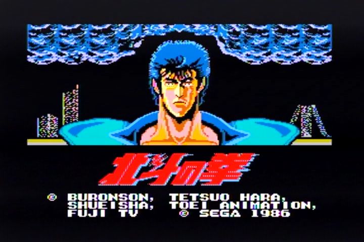 北斗の拳 ©BURONSON,TETSUO HARA,SHUEISHA, TOEI ANIMATION,FUJI TV ©SEGA 1986 機種:SEGAMarkⅢ/MASTER SYSTEM Wii(バーチャルコンソール) PS2(SEGAAGES2500 Vol11 北斗の拳) ジャンル:アクション 1986年発売(PS2は2004年、Wiiは2008年) 1986年にセガマーク3で発売後、最高傑作と評され ハードの牽引となった名作「北斗の拳」 と、PS2のSEGAAGES内で書かれています。 その通りだと思うよ、うん。 原作の最初からラオウを倒すところまでを再現した 横スクロール型のアクションゲーム。 全6面で構成されていて、各面には中ボス、大ボスが 控えています。 どの敵も原作を知ってるとニヤッとしてしまいます。 ※今回は一部PS2版の画面を使用しています