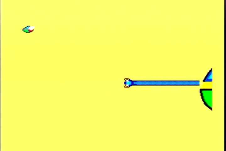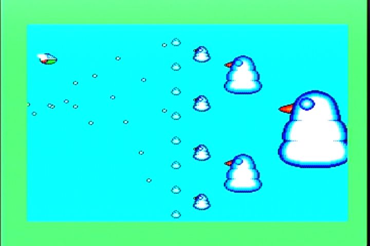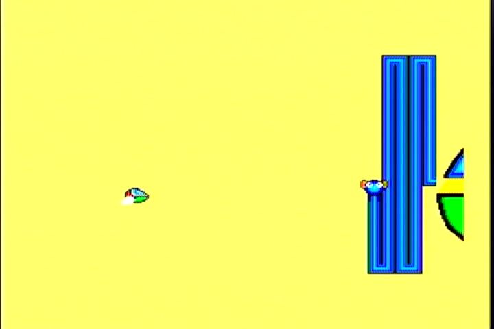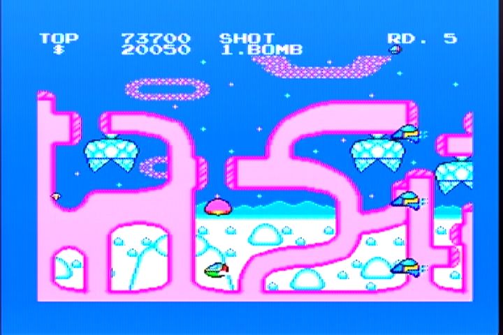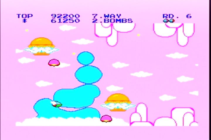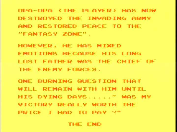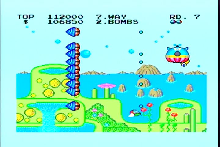 <5面> 氷の惑星。ここは本当に背景と敵の弾を見間違います。 そんな時の必勝法は「撃たれる前に撃て」 強力な武器で押し切るのがオススメ。 7Wayがどんどん値上がりするけどきにしなーい。 <5面ボス ポッポーズ> 1+2+4+8=15匹のポッポーズがこの面のボス。 小さなポッポーズが登場したら片っ端から撃ち落していくのが 本来の戦い方。画面の様になったら負けを覚悟した方が・・。 画面の上下をめいっぱい使って動くと案外弾幕に隙間ができるもんです。 そこを上手くすりぬければ、この状態からの逆転もありえるかも。 <6面> 雲のステージ。前線基地も気球っぽくてそれらしいステージ。 7Wayなら突破できるんだけど、ノーマルショットじゃちとキツイです。 ここまでくると前線基地もかなり硬いですしね。 <6面ボス dz・デノ・ローマ> ドジでのろーまな亀がこの面のボス。アーケードからは差し替え。 甲羅の部分から弾をポンポンとばしてきます。ドジでノロマだなんて バカにしてる余裕はありません。 簡単な攻略法は、敵が最初の弾を撃って来るタイミングで ヘビーボムを落とすと一発で倒せます。 <7面> 水の惑星。背景もがんばってますね。 プレイしてる最中は見てる余裕ありませんが。 ここでも頼りになるのは7Way。後半はこればっかですが。 敵の攻撃を避けきれる自信がないんですもの。 <7面ボス IDA-2> でかい顔。この顔が分裂、合体を繰り返して襲ってきます。 画面のように合体してるときにショットやボムで攻撃。 てこずっていると、ものすごい速さになっていくので 早めに決着をつけたいところ。 <8面> 通称ボスラッッシュ。1面から7面までのボスが再登場。 アニメやマンガだと復活したボスは弱いのが定番ですが、 このゲームでは同じ強さで登場。 それでも、そいつらを全部倒すと・・・ ボスが登場です。 この青い虫みたいなエイリアンは頭が弱点。 全部で6匹出てきます。 移動パターンはそれぞれ違いますし、後半になればなるほど 動きが速くなるので倒すのが難しくなります。 後半の2匹はこの位置からヘビーボムを落とせば倒せます。 7Wayとヘビーボムはつくづく偉大だなぁと。 この2つの武器に頼りっぱなしでもクリアできちゃんですもの。 そして、青い虫を6匹全て倒すと・・・ オパオパ(自機)のお父さん登場。そして感動のエンディングへ。 さあ、英語の問題です。上の英文を日本語に訳しなさい。 そうすれば感動のエンディングです。 このゲームを買った当時は訳せませんでしたw
