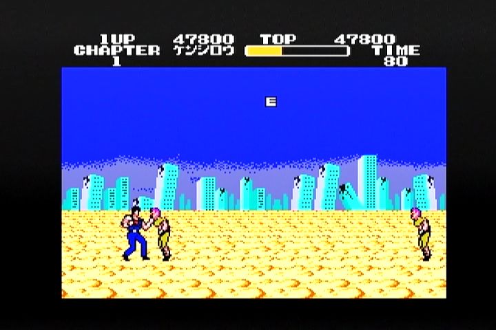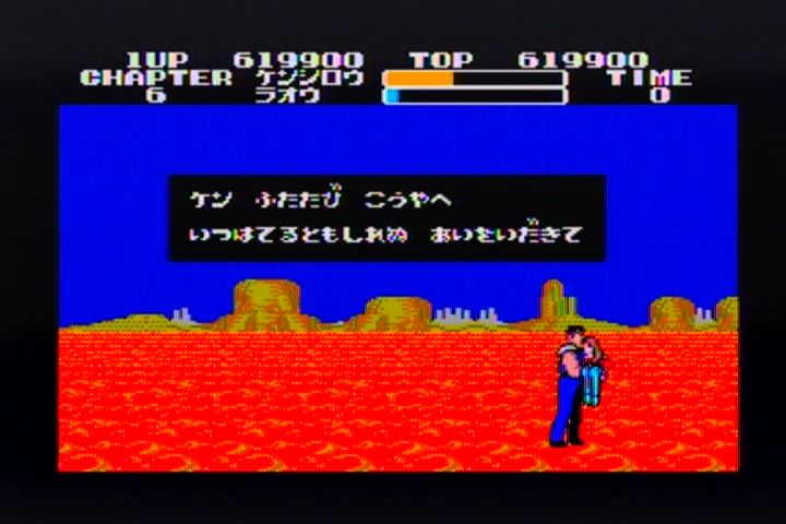 6面 『けんおうラオウ』 もう、タイトルそのままですね。 この面はいきなりラオウとの対決です。 トキやサウザーのようにパターンを見つける必要はないのですが、 ラオウはただ単純に強いです。 しかも、こちらから与えるダメージはいつもの半分。 つまり、ラオウの体力ゲージが2倍あるのと一緒。 こちらは普通にダメージを受けるので、けっこうつらいです。 しかし、ここまで来たら後には引けません。 『我が生涯に一片の悔いなし』 苦戦の末、ラオウを倒すとこの場面。 北斗の拳を語る上ではずせない名場面ですね。 ケン再び荒野へ いつ果てるとも知れぬ愛を抱きて ユリアと無事再会です。通常ならここでこのゲームは終了ですが・・ この画面で方向ボタンの↑を連打すると、 7面に突入です。 この面はボス戦オンパレード。 ただ、相手を倒しても体力は回復しないので 無傷で倒せるか、残機に余裕がないとクリアは難しいです。 攻略方法は一緒なんですけどね。 そして、全てのボスキャラを倒すと スタッフロールなどでることなく、この画面で終了です。 <ウラワザ> 各面でタイムが80の時に大ジャンプをすると 画面をEの文字が横切ります。 この文字を取ることができれば、体力が回復します。 また、2面か5面の建物のライオンにパンチを出すと Pの字が現れます。これを取るとBGMが変化して、 敵の攻撃を8発くらうまで無敵となります。 無敵が終わるとBGMも元に戻りますよ。 あと、このPとEは同じ面では両方取る事ができないので 2面と5面はどちらか選択する必要があります。 状況をみて臨機応変にね。