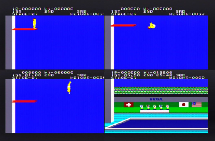 回転している間は連打、連打。連打が速いと面白いようにくるくる回ります。 そして、最後は入水姿勢をとってフィニッシュ。 単純に回転数と入水姿勢で得点が決まります。規定点以上でクリアです。 次の競技は跳馬