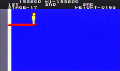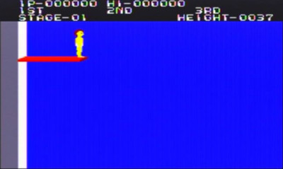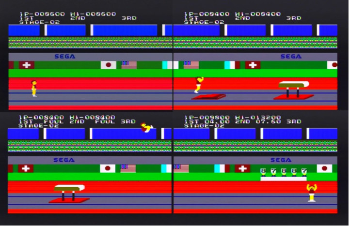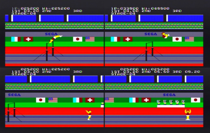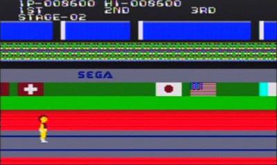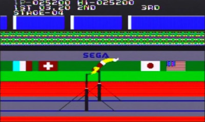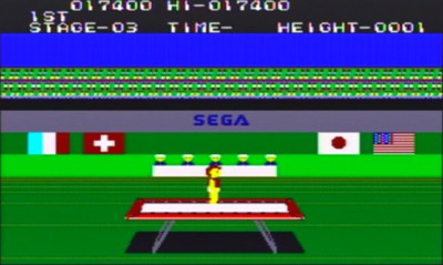 最初の回転で勢いをつけてジャンプ。 タイミングが悪いと真上に飛んだり、後ろに飛んだりしちゃいます。 この競技、なぜか、飛距離も得点のポイントです。いい角度で飛び出しましょう。 その後はやっぱり連打。飛び出した後は跳馬と一緒です。 規定点を叩きだしたらクリア。規定点が上昇して2周目に突入です。 連打装置を使わなくても1周クリアならできますよ。指と手首が痛くなりますがね。 実はこのゲーム、ハイパーオリンピックほど盛り上がりません(ぁ 何故もりあがらないかを考えてみました。 ハイパーオリンピックはタイム、あるいは距離を競う種目で 構成されているのに対しこちらの種目は得点を競うものでできています。 あっちは限界まで数字を競えるのに、こっちは10点満点以上はでません。 つまり、ある一定以上のものは全て同じ結果になってしまいます。 この差が大きいのかなと思ったりします。まあ、今更どうでもいいんですけどね。 オマケで連打装置を使って、5周目まで行ってみました。