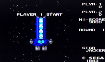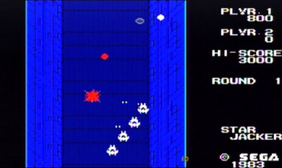 この面の終了までワープします。この画面じゃ解りませんが、背景が高速スクロール。 ただ、あのボス敵を倒し損ねると後半戦がスタート。 なので出来る限り・・というか絶対倒しておきたいところです。 そして、面クリアするとスコアに応じて戦闘機が補充されます。SG版は最大4機まで。 ステージ後半で自機が少ないときは、ゴールまでいければ・・・とつい力が入っちゃいます。